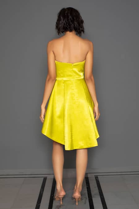 Lime strapless reversible dress with high low hem.