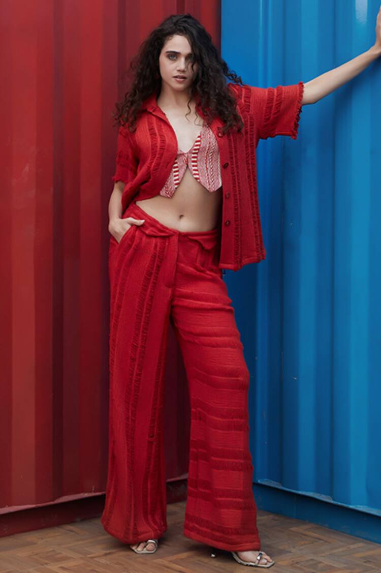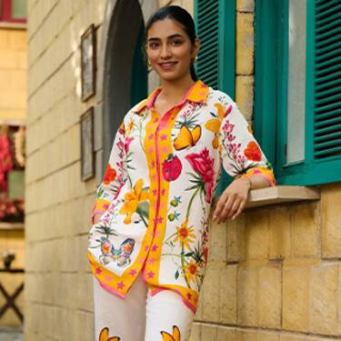 Orange Crepe Collared Shirt And Skirt Set