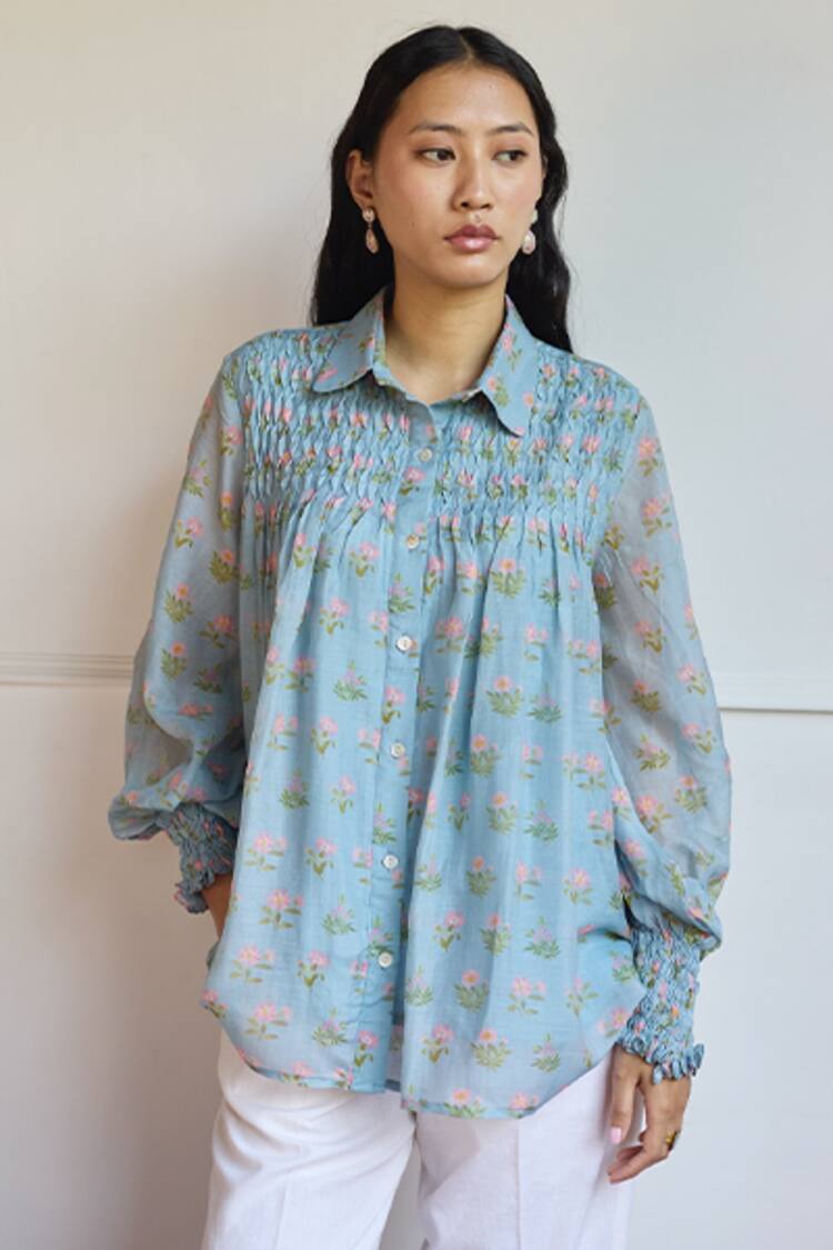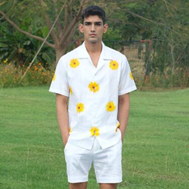 Green Nylon Fabric Flowers Collared Felt Floral Embroidered Shirt