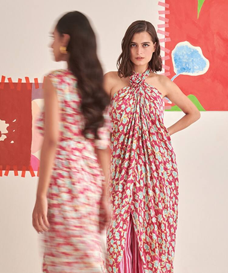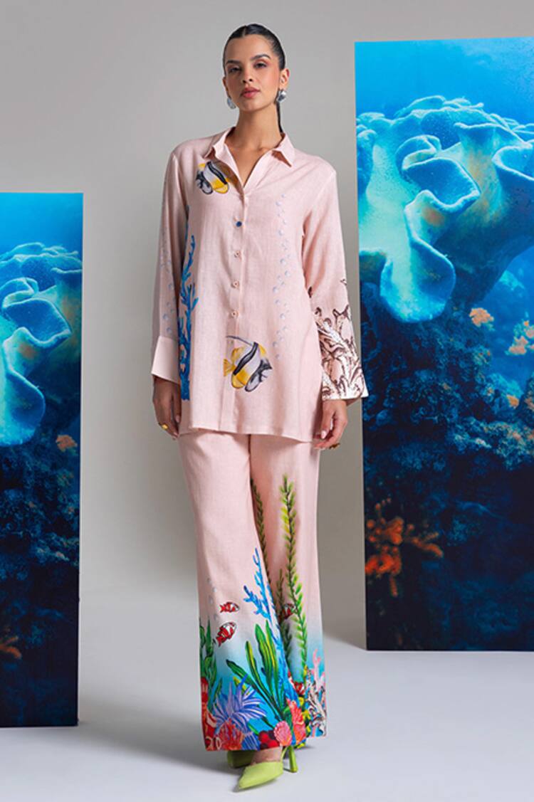 Multi Color Modal, Silk Collared Abstract Print Shirt And Pant Set