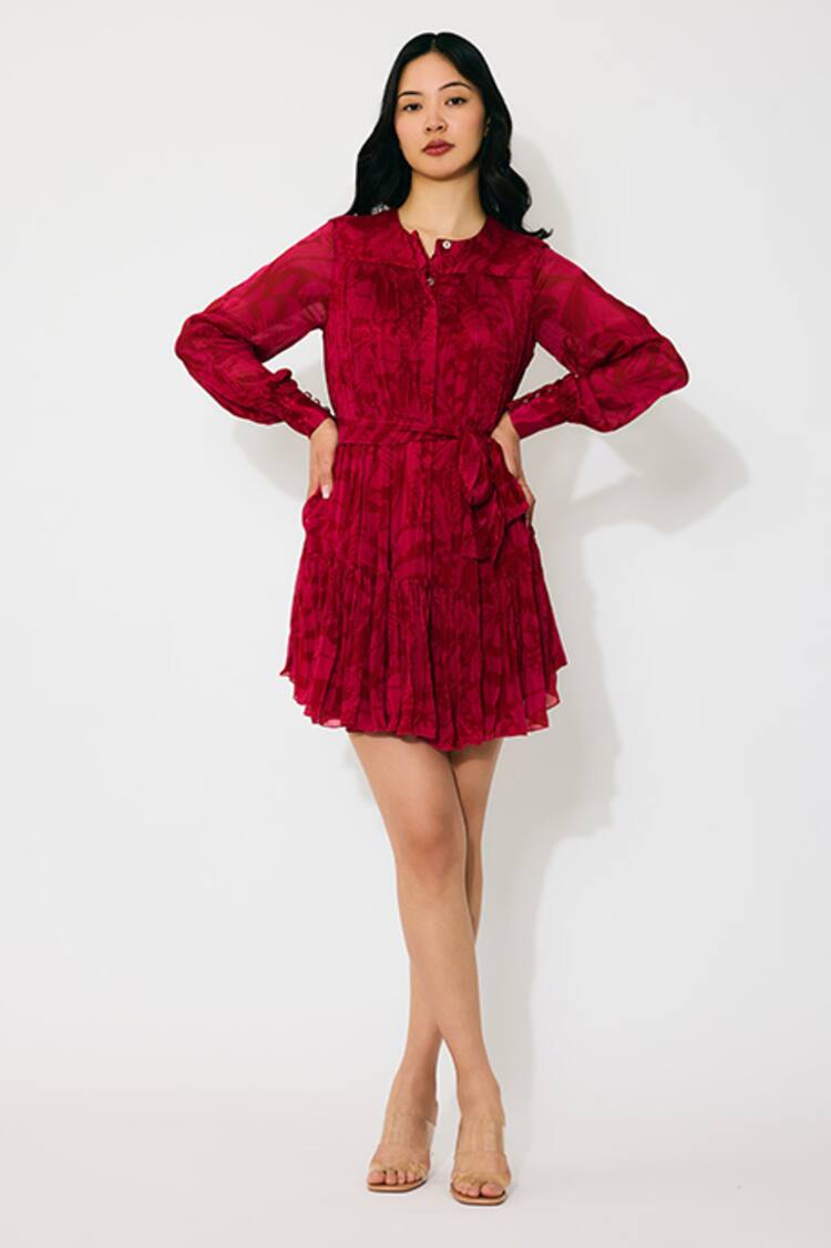 Maroon Microsuit Embroidery V-neck Crimson Box Pleat Blazer Dress