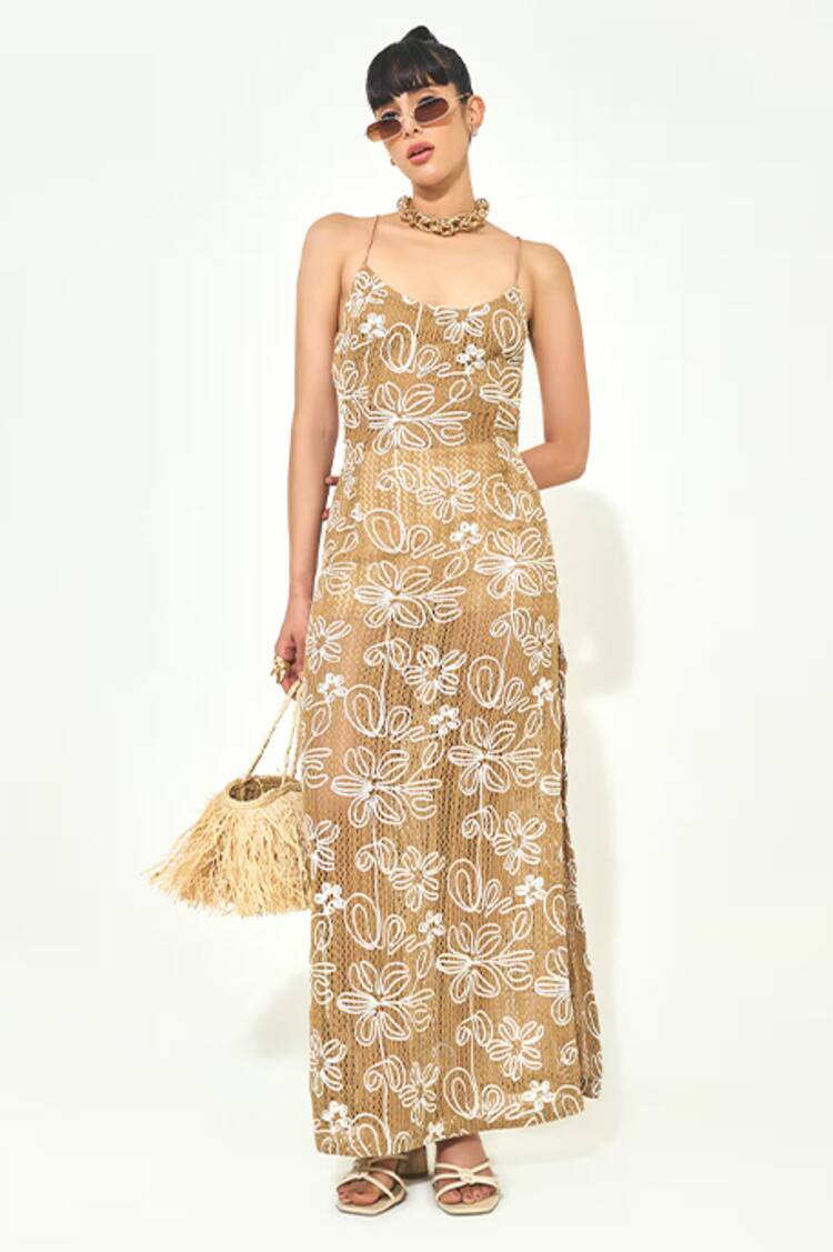 Green Linen Open Neck Floral Embellished Dress
